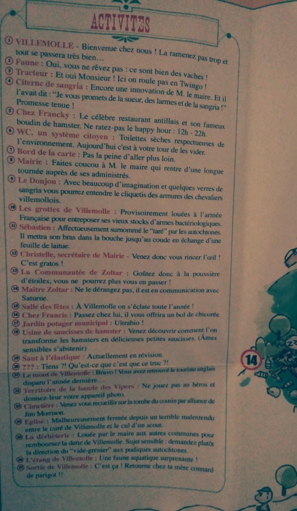 Et vous avez le droit avec à un plan de la ville dessiné par Winshluss et à un guide touristique dont je vous mets de extraits en dessous et qui donne bien le ton voulu par l’œuvre !